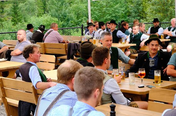Zünftig geht es zu in unserem Biergarten inmitten von Almwiesen und Berggipfeln.